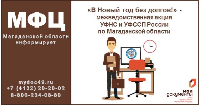 20 декабря 2019 года с 14.00-16.00 ч. на базе Магаданского областного государственного автономного учреждения «Многофункциональный центр предоставления государственных и муниципальных услуг» Управлением Федеральной службы судебных приставов будет проводится информирование жителей региона об имеющейся задолженности по исполнительному производству и способах их оплаты в рамках акции «В Новый год – без долгов!».