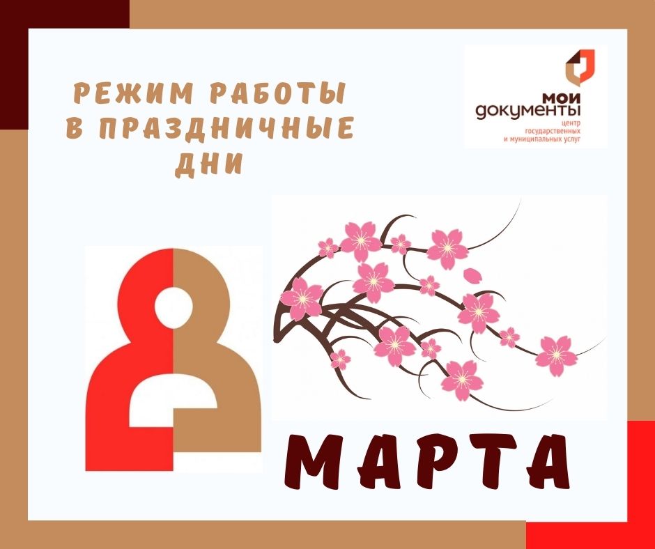 Режим работы МФЦ в праздничные дни:6 марта – 10-00 до 18-00