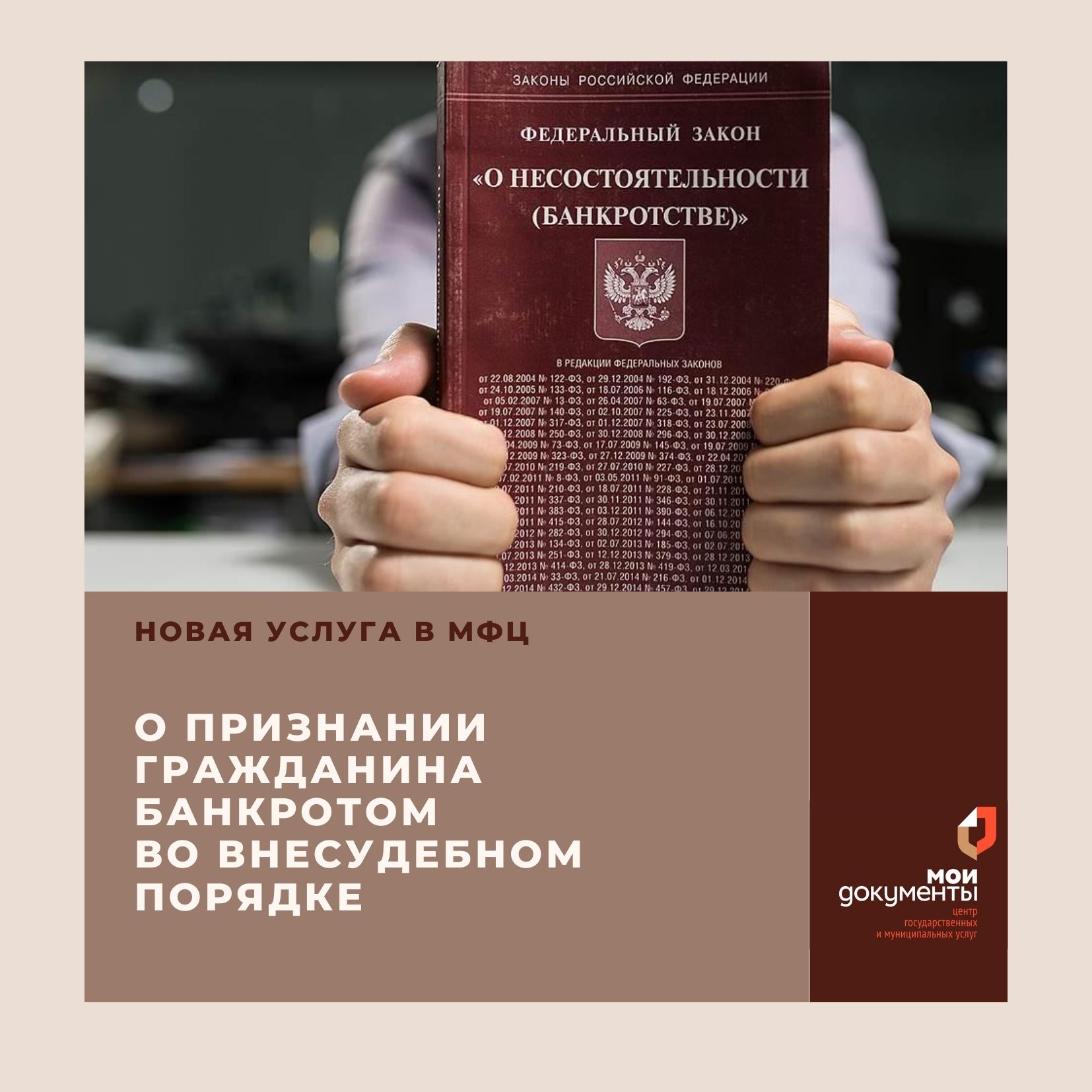 Гражданин имеет право обратиться с заявлением о признании его банкротом во внесудебном порядке в МФЦ по месту жительства или месту пребывания в соответствии с поправками в Федеральный закон от 26.10.2002 N 127-ФЗ «О несостоятельности (банкротстве)». Основное преимущество внесудебного банкротства заключается в том, что оно будет бесплатно для должника и проводится без участия суда и финансового управляющего.